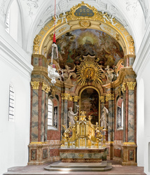 Die Apsis wurde 1721 von D. Zimmermann mit Säulen und Pilastern in Stuckmarmor als Altararchitektur verkleidet. Die letzte Renovierung stellte die ursprüngliche Lichtführung am Altar wieder her. Der Apsisbogen wird durch reich vergoldeten Stuck hervor gehoben. Er trägt die Widmung Deo et Agno, Gott und dem Lamm. Die Plastiken auf den beiden Seiten zeigen rechts den Apostel Philippus, links Johannes den Täufer. Das 1724 von J. B. Zimmermann gefertigte Altarblatt stellt den Kirchenpatron in visionärer Schau auf der Insel Patmos dar.