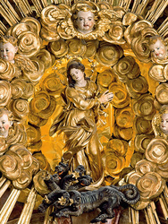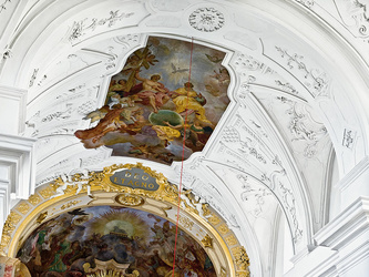 Die von hinten belichtete Darstellung des apokalyptischen Weibes leitet zum Fresko mit der Darstellung der Anbetung des Lammes über. Der frei stehende Sakramentsaltar von 1778 ist ein Werk von J. G. Winterstein, der zwei Jahre später auch das elegante klassizistische Chorgestühl unter Verwendung der gotischen Stallen schuf. Dessen Aufsätze sind zum Teil aus Pappmaché gearbeitet, die linke Seite wurde 1951 rekonstruiert. Im Chor konnten romanische Türgewände freigelegt werden, die zu den Kapellen in den geplanten Chorwinkeltürmen führten. Den Bogen zum Chorjoch rahmen zwei Plastiken von J. P. Wagner aus der Zeit um 1760 ein. Dabei handelt es sich links um den Kirchenpatron, rechts um den heiligen Johannes Nepomuk unter dessen Patronat eine Bruderschaft an der Kirche bestand.