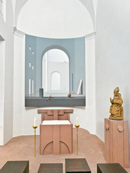 Gleich beim Betreten der Kirche fallen die beiden Kapellen rechts und links des Eingangs ins Auge. In der linken hängt ein Retabel von Michael Morgner mit dem Thema „Golgotha“, wozu die Kreuze an der Rückwand korrespondieren. Besonderer Blickfang ist eine Plastik des entkleideten Christus von Johann Peter Wagner aus dem 18. Jahrhundert. Für die gegenüberliegende Kapelle schuf der zeitgenössische Künstler Ben Willikens ein Altarbild, die spätgotische Sitzfigur des heiligen Wolfgang stammt aus dem Spessart.